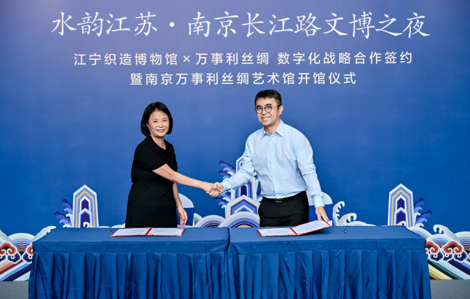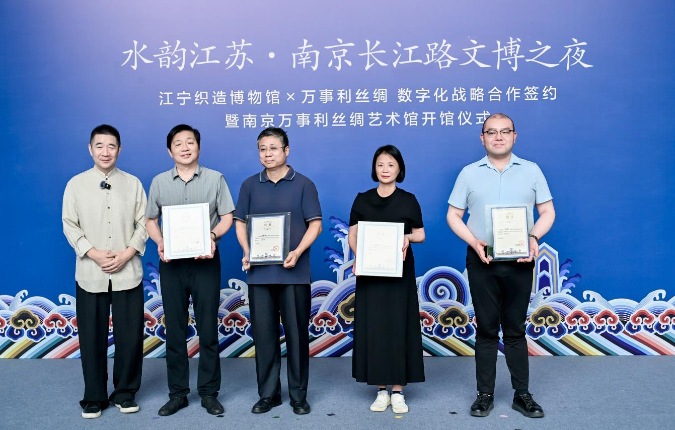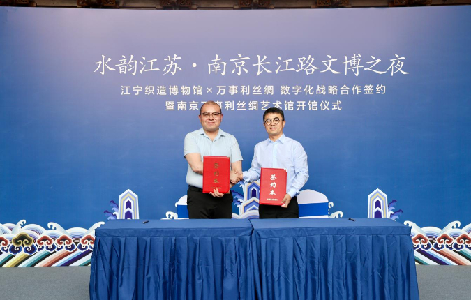 9月29日,作为“水韵江苏·南京长江路文博之夜”的重要主题活动之一,“江宁织造博物馆”与“江苏万事利文化科技有限公司”正式签署数字化战略合作协议,南京万事利丝绸艺术馆同步开馆。此次签约不仅是两家文化标杆单位的强强联合,更标志着“江宁织造博物馆、万事利丝绸、文都云”三方数字化合作全面启动,共同在长江路上开启南京文博数字化发展的新篇章。