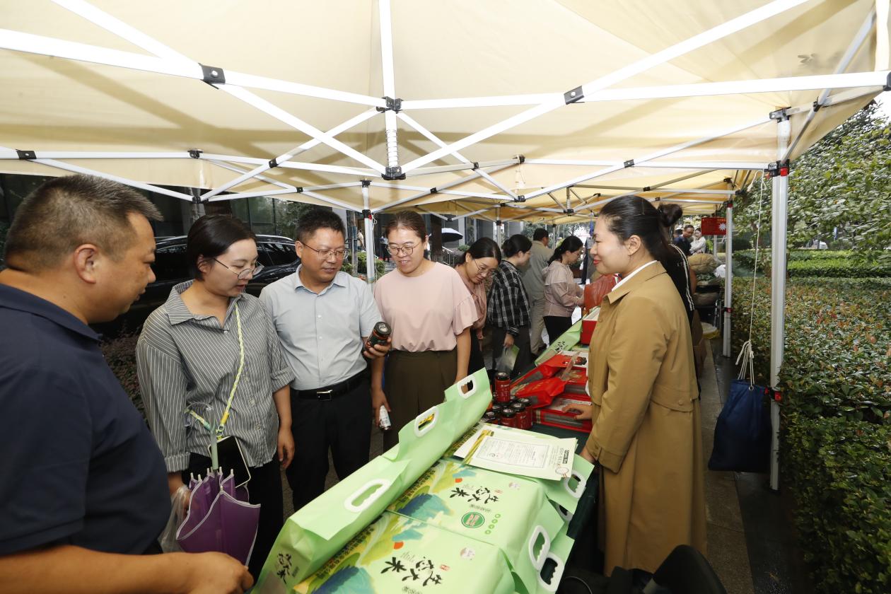 左手办公包,右手农产品,江苏省统计局的午间,被淮阴的“土味”香疯了!9月29日中午,江苏省政务服务中心食堂前一改往日的宁静,变身成为一个热闹的“乡村市集”,因为乡村振兴助农直通车进省统计局名优农产品展销活动在这里火热开场。本次活动由江苏省统计局办公室、省委驻淮阴区乡村振兴工作队联合主办,淮阴区供销合作总社承办,旨在搭建农产品产销对接平台,助力乡村振兴。