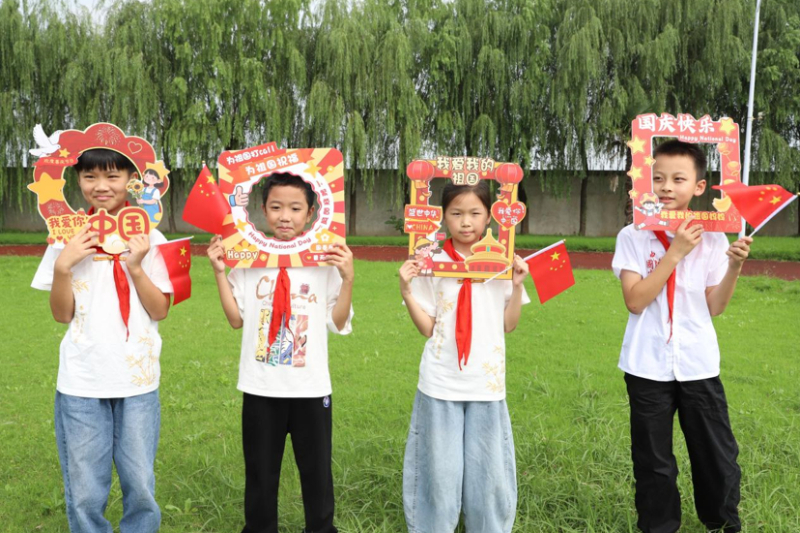 活动尾声,“我与国旗合个影”将氛围推向高潮。操场中央五星红旗展开,学生身着红领巾有序合影:或敬少先队礼,或比“爱心”,或举“为祖国打call 为祖国祝福”牌子。“和国旗合影,我很骄傲!”李同学说。此环节旨在激发学生们的爱国热情,树立“强国有我”志向。