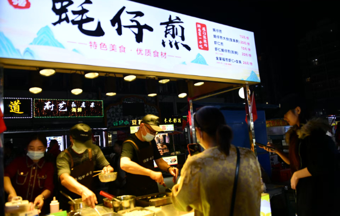 几位年轻人在蚝仔煎摊前有说有笑,分享着各自挑选的美食。“假期回老家,听说这边新开了夜市,就约着同学一起来逛逛,”一位本地大学生兴奋地说,“没想到洪泽现在也有这么热闹的夜市,感觉一点都不比大城市的差。”