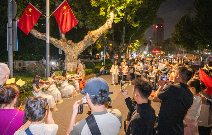 当晚,长江路开启限时步行街模式,更方便市民游客沉浸式Citywalk,尽情享受假日夜游的松弛与浪漫。街头快闪的接棒登场,将现场氛围推向高潮。在南京图书馆北侧公交站台前,青年表演者带来以小提琴、大提琴等弦乐为主的演出,展现古典音乐之美;在总统府景区入口西侧,一场街舞Battle 点燃了现场的热情,舞者们随着动感的音乐尽情舞动,酷炫、高难度的动作,引得围观群众阵阵欢呼;在总统府景区门口,南京长江路文博之夜音乐快闪大篷车开了出来,青年乐队在此激情演唱热门歌曲。此外,还有古风巡游、人偶互动、特色市集等丰富活动,为夜色中的长江路增添了更多活力与惊喜。