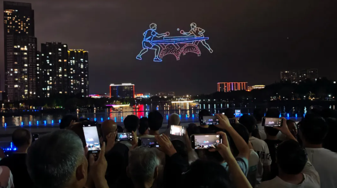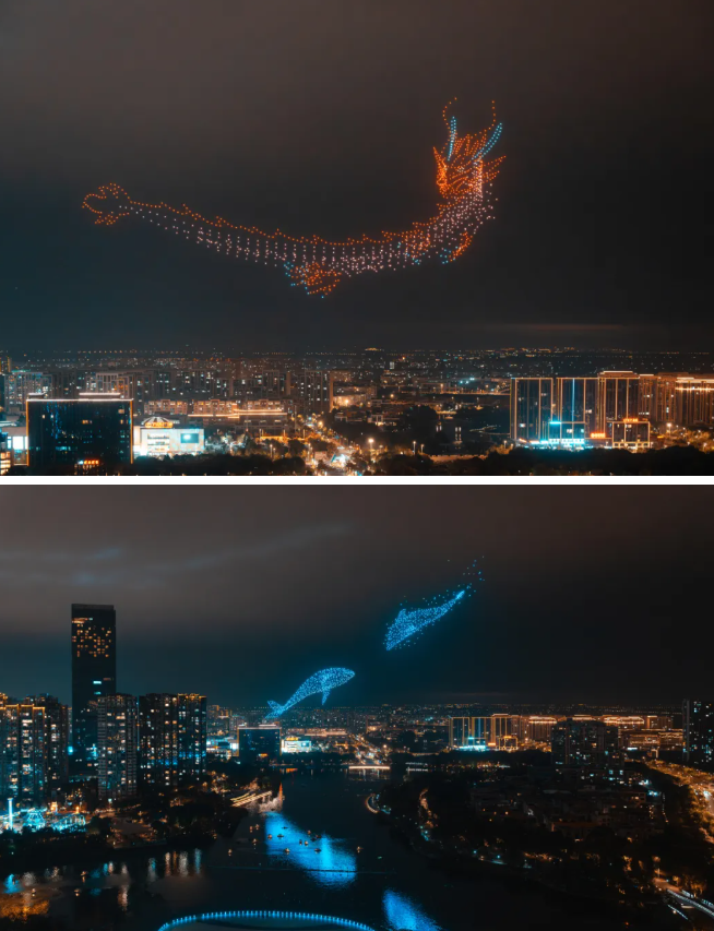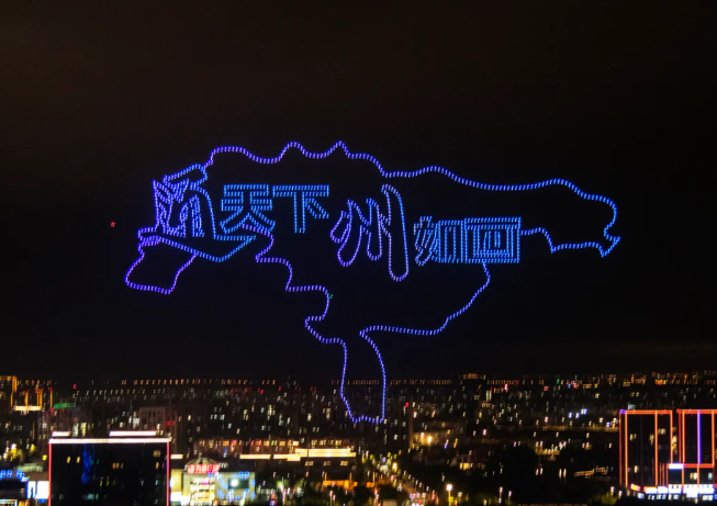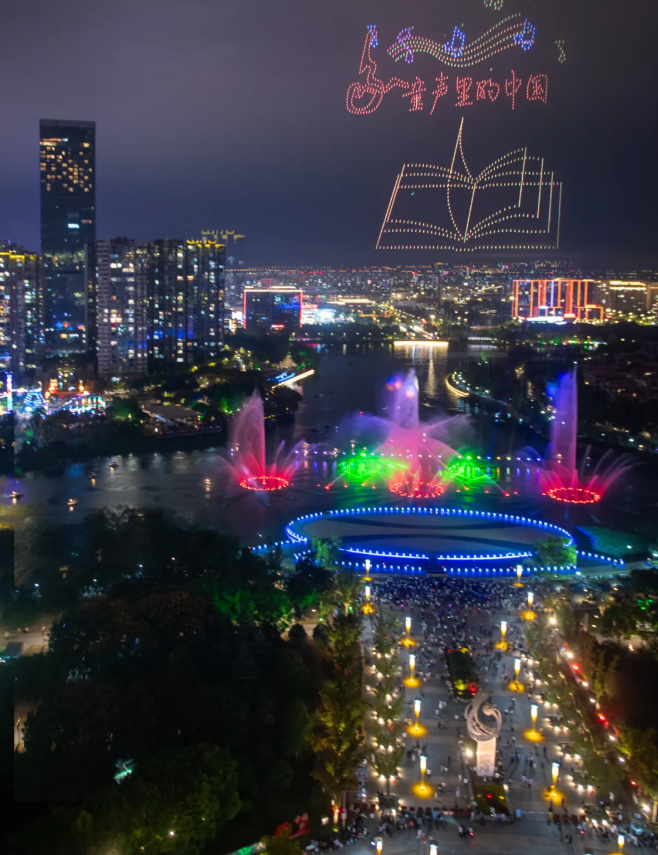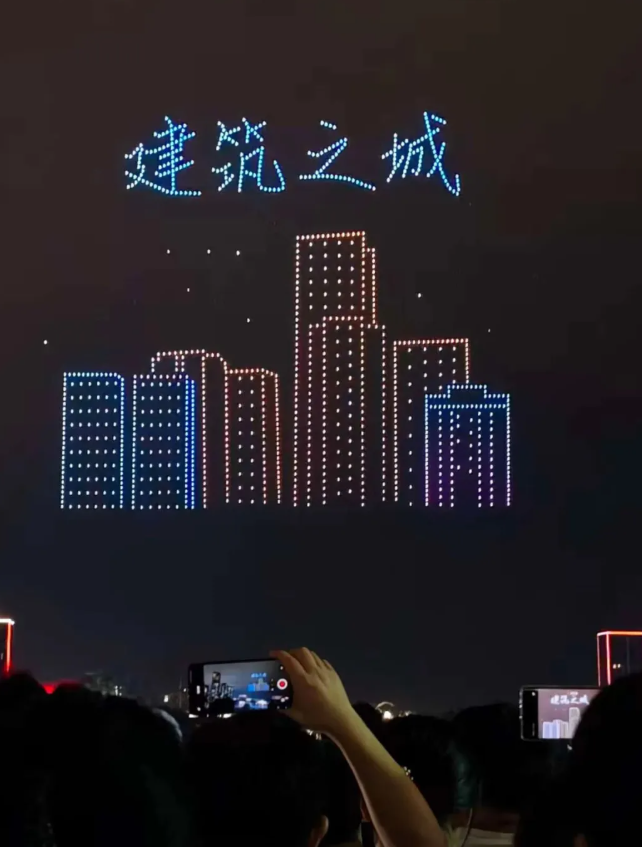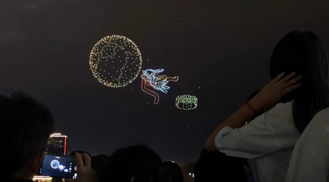 市民惊叹连连,纷纷举起手机。在半小时的音乐喷泉表演后,很快迎来了第二场。1200架无人机如璀璨星辰缓缓升空,在夜空中排列组合,随着空灵的音乐,变幻出一幅幅精美绝伦的图案。