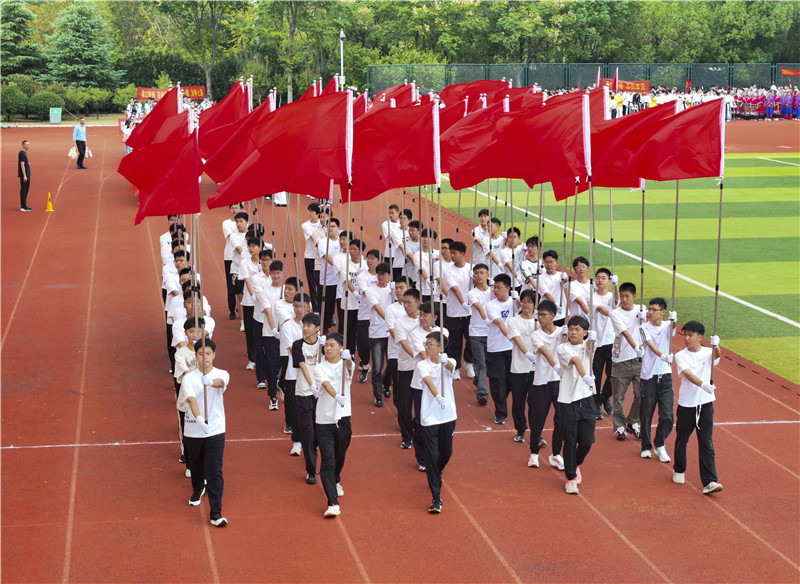 10月8日,江苏省泰兴中学第62届校运会开幕,全校师生齐聚操场。开幕式上,各班级代表队精神抖擞走过主席台。本届运动会设短跑、跳远等传统项目及趣味竞赛,旨在展现学子拼搏向上的青春风采。(顾继红 张莉)