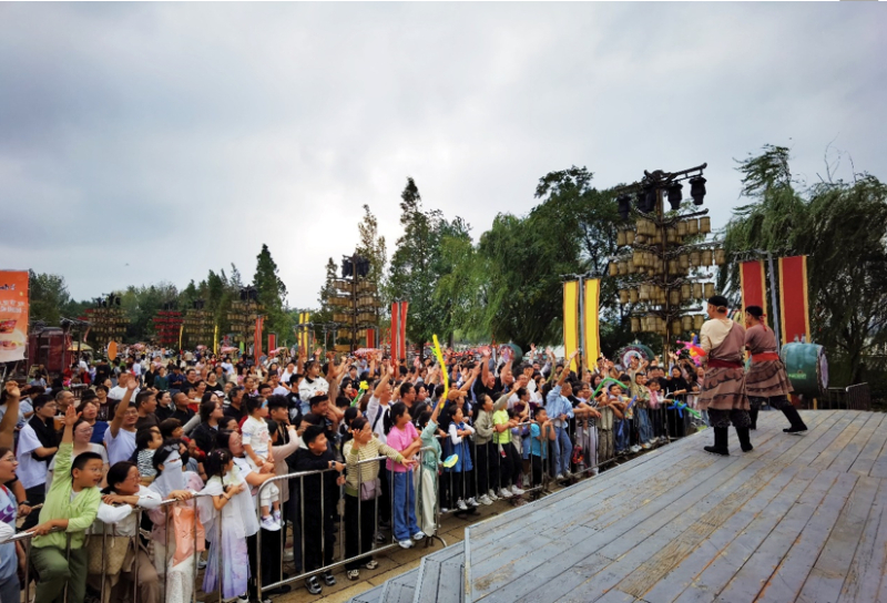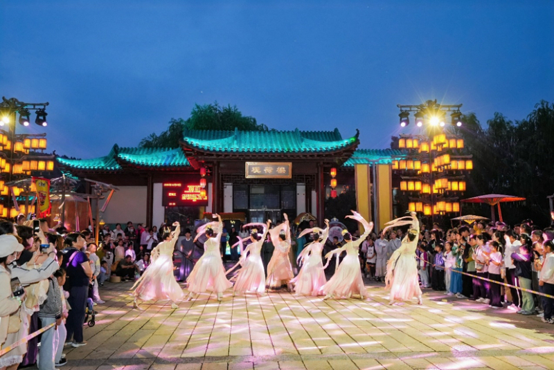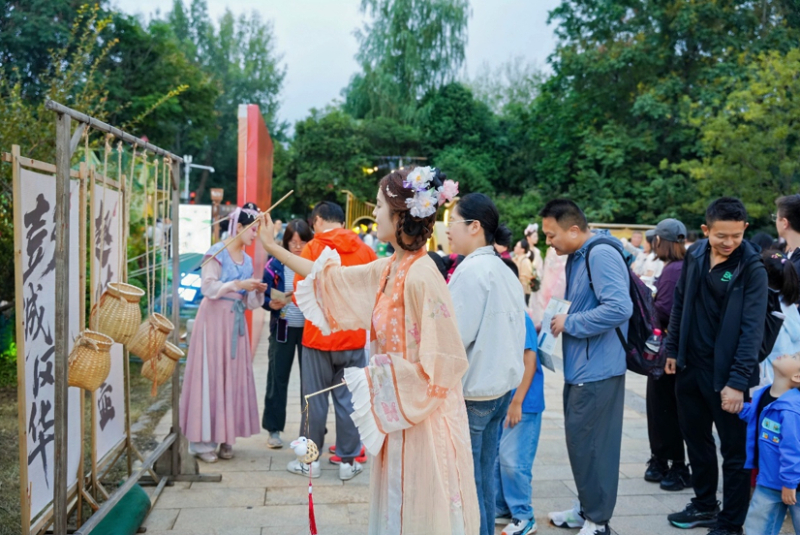 白天,人流如织,演员们的舞姿和节目吸引众多游客驻足观看;摊位前,各式各样的特色商品备受青睐。游客们积极参与“楹联诗会”“宋风四雅”等丰富的互动游戏,在收集印章的乐趣中感受文化的魅力。