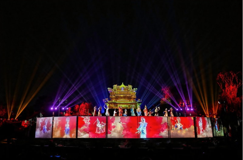 演出通过光影艺术勾勒写意山水,再现宋代风雅生活图景。游客乘船漫游3.3公里水域,在“明月几时有”“江山揽胜”等八幕场景中,感受“人在船中坐,船在画中游”的诗意境界。先进的数字科技活化苏轼文化,重现“守城抗洪”等历史场景,为观众带来强烈的视觉震撼与感官体验。