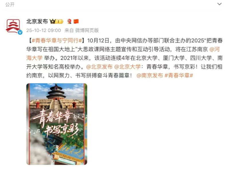 10月12日晚,由中央网信办等部门联合主办的2025“把青春华章写在祖国大地上”大思政课网络主题宣传和互动引导活动,在江苏南京的河海大学举办。