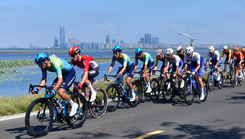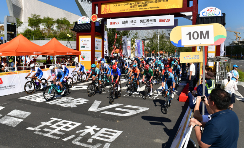 10月10日,江苏银行·2025第十三届环太湖国际公路自行车赛暨长三角穿越赛吴江苏州湾环湖赛在苏州吴江鸣枪开赛。来自世界各地的22支队伍、138名职业运动员齐聚东太湖S湾,展开精彩竞逐。