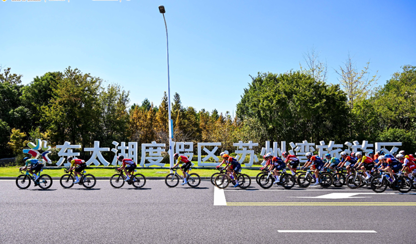 随着发令枪的声响,138名参赛运动员飞驰而去,一路南行先后经过苏州湾文化中心、苏州湾体育公园、苏州湾梦幻水世界、王焰温泉酒店、东太湖驿站等标志性地标,全线既可欣赏太湖滨水人文景观,也将原生态的太湖农文旅风貌尽收眼底,迎面的湖光山色、隔湖相望的人文建筑与车轮驰骋的竞技速度相互交融,勾勒出苏州吴江东太湖度假区生态宜居高质量生活的一幅蓝图。