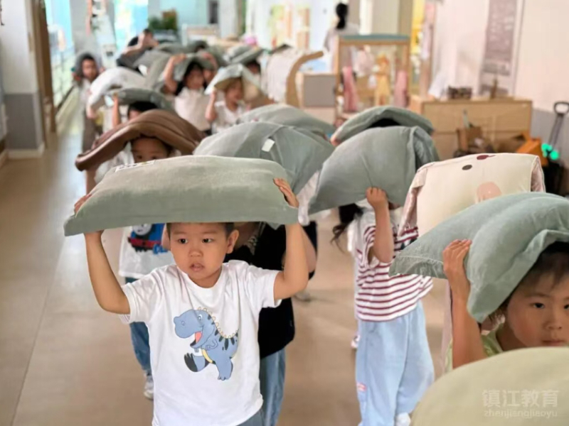 镇江市中山路中心幼儿园中建园区组织全体师生开展地震应急疏散演习。急促的警报声在园内响起,孩子们在老师引导下,迅速拿起身边小枕头、软垫护住头部;待“强震”暂歇,又在老师带领下,保持弯腰低身、护头姿势,沿预定路线快速有序地从各活动室撤离至室外安全地带。