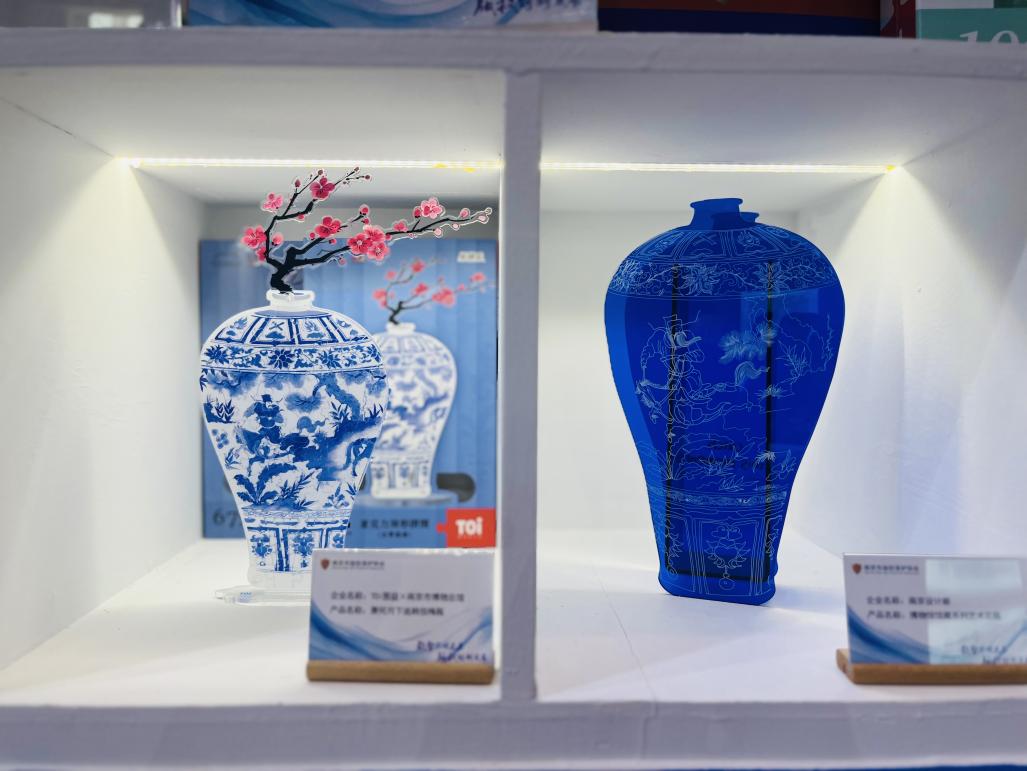 作为江苏展区的“颜值担当”,南京展区的展品可谓琳琅满目。在现场看到展出作品不仅有“文学之都——宁好”“南京云锦”“十竹斋笺谱”等耳熟能详的城市文化IP衍生产品,还有“跳舞的瓦当”“明朝那些城门”“六朝雅韵”等城市文博IP好物。有趣的是,现场还发现来自南京设计廊文创发展有限公司的“镇馆之宝萧何月下追韩信亚克力艺术花瓶”与南京图益的“市博物总馆·萧何月下追韩信梅瓶拼图”正撞了个满怀。它们在南京展区相遇,却以不同的产品形态展现着各美其美的创意。工作人员说,“本次参展,仅南京设计廊一家企业就带来了金属书签、摇摇乐活页本、盲盒笔等5款萧何月下追韩信梅瓶系列产品”。随着南京版权市场的愈加繁荣,越来越多的产品品牌与博物馆展开合作,助力城市文化传播。