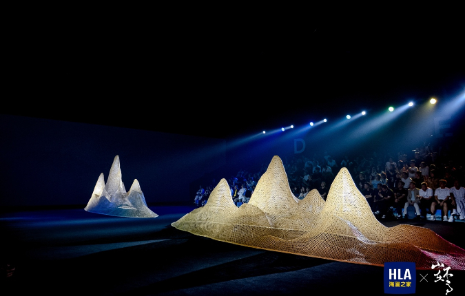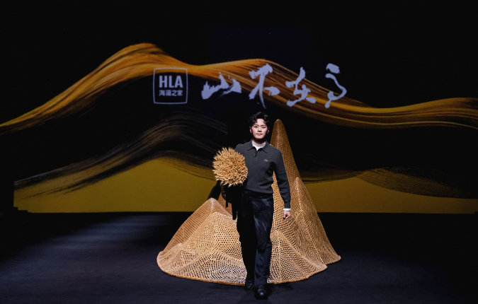 秀场中央,由非遗竹编艺术家宋亮亮为海澜之家「山不在高」量身打造的艺术装置尤为引人注目。他以极具现代感的流线型编织手法,将传统竹艺化为一座灵动的“山形”结构,在秀场空间呈现出疏密有致的东方画境。灯光穿过竹编缝隙,在秀场地面投下斑驳光影。模特们身着「山不在高」系列款款走来,与此装置遥相呼应,让古老的手工艺在当代时尚语境中焕发出全新的生命力。
