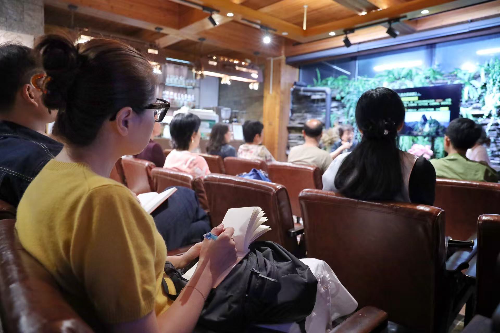 取名自《诗经》意境的二亩半艺术空间,由一栋老房子巧妙改造而成。白墙小院、玻璃屋顶与绿植墙相映成趣,咖啡、书店、展览区的多功能叠加为个人阅读提供自在乐趣,随着2024年“钟书房”的挂牌二亩半艺术空间内渐次深入文化交流层面。每月都有各色的阅读主题活动在此开展。器曰书坊创始人周小舟带领读者透过小小藏书章解读文人审美意趣;作家阮夕清与读者探讨《燕子呢喃,白鹤鸣叫》中的生命哲思,将阅读引向更深层的精神对话……从个人阅读走向文化共享,高品质的阅读交流讲座吸引到越来越多同频的读者。