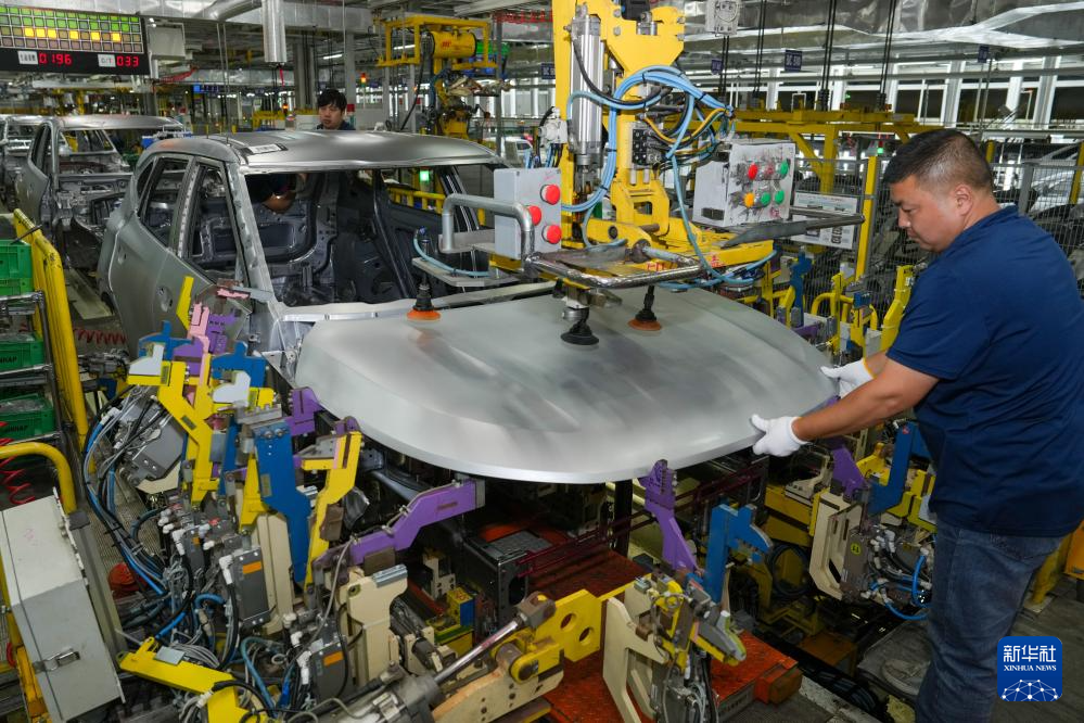 工人在佛吉亚(盐城)汽车部件系统有限公司汽车配件生产车间内工作(9月18日摄)。