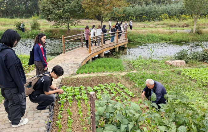 在赵湖组的田间地头,学生们不仅写生创作,更与村民亲切交流。一位正在菜地忙碌的老大爷热情地向同学们介绍菜地里种的马齿苋,并分享了从种植、企业收购到加工成包子、水饺销往城市的完整链条。这堂生动的“田野调查课”让同学们对乡村振兴有了具象而深刻的理解。