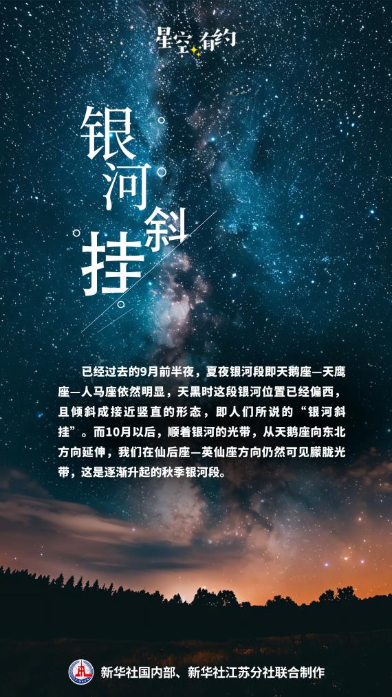 已经过去的9月前半夜,夏夜银河段即天鹅座—天鹰座—人马座依然明显,天黑时这段银河位置已经偏西,且倾斜成接近竖直的形态,如“光瀑”垂落天际,即人们所说的“银河斜挂”。而10月以后,顺着银河的光带,从天鹅座向东北方向延伸,我们在仙后座—英仙座方向仍然可见朦胧光带,这是逐渐升起的秋季银河段。秋季银河段是我们转向银河系盘外方向所看到的景象。