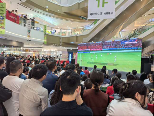 在通州万达广场,巨型屏幕前同样座无虚席,空气中弥漫着紧张与期待,所有人的目光都牢牢锁定在南通对阵无锡的激烈对决上。每当赛场出现精彩传球或惊险射门,人群中便爆发出阵阵惊呼。手持应援物的王先生紧盯着屏幕,神情专注:“心情很激动,也很紧张,两支强队都展现了实力,希望我们南通能杀进决赛!”他的话语道出了众多南通球迷的心声。一旁的曹敏月同样被气氛感染:“现场氛围很好,看得挺紧张的,希望南通队能赢!”