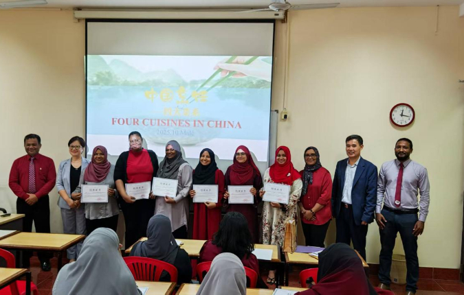 在参访活动中,出访团队陆理民、刘寒雨老师在马尔代夫理工学院开展了一场别开生面的“中文+中国饮食文化”授课交流活动,以生动有趣的方式向马方师生传递中国饮食文化的博大精深与中国职业教育理念。马方师生积极参与培训,对中国饮食文化表现出浓厚兴趣,交流现场互动积极,反响热烈。培训结束后,洪涛为参训学员颁发培训证书,并与马尔代夫理工学院校长合影留念,为本次文化交流活动画上圆满句号。