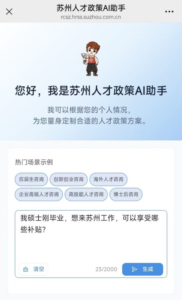 一项青年政策:苏州青年人才9条措施自今年发布以来,为高校毕业生从面试、租房、购房、生活等全流程提供支持。对全日制应届本科以上毕业生来苏州求职面试的,给予最高2000元一次性交通补贴,同时提升青年人才驿站服务水平,为来苏求职就业青年人才提供累计最长14天的免费住宿。对新引进的全日制应届博士、硕士和本科生分别给予每月不低于1500元、1000元、800元的租房补贴,补贴期限一般2年。应届高校毕业生首次申领成功后,可一次性获得6个月补贴,续领补贴“免申即享”。为提升人才服务体验,实现政策与人才的智能匹配,苏州人才上线“政策AI助手”,运用人工智能技术,为各类人才提供精准化、7×24小时在线的一站式政策查询服务,帮助青年人才看懂政策、用好政策。