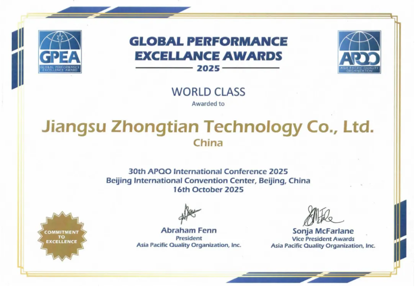 由亚太质量组织主办、中国质量协会承办的第30届亚太质量组织国际会议上,中天科技获授“全球卓越绩效奖”(World Class Winner)与“亚太质量组织国际最佳实践奖”(AIBP)。中天科技用实力证明了自己不仅赢得了质量管理的“团体金牌”,更在单项实践上达到了国际最佳水平——这是对其多年来坚持对标国际最高标准的最好回报,更是走向全球化一流企业的重要里程碑。