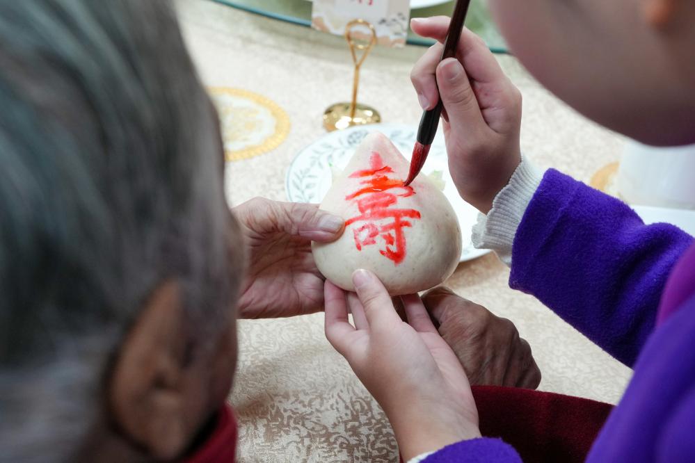 伴着全场齐声高唱的生日歌,两位老人一同切开生日蛋糕。紫金草童声合唱团的孩子们围拢过来,小手握着笔,和老人一起,在寿桃上描画“寿”字,祝福老人福如东海、寿比南山。