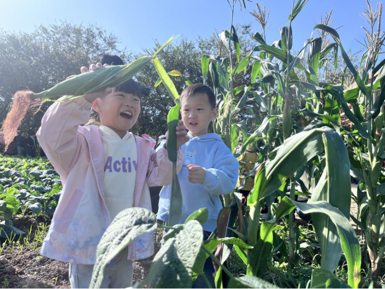 田间实践环节更是让孩子们过足了“小农夫”瘾。爷爷奶奶先向孩子们演示各种农具的用法,随后孩子们深入田间,有的蹲在地里小心翼翼地刨土;有的举着刚挖出的红薯向同伴炫耀;还有的在剥玉米时,发现“玉米须像爷爷的胡子”,现场笑声不断。指尖沾满泥土的触感、农作物生长的细节,让孩子们在劳动中直观感知“春种秋收”的规律,也懂得了“每一粒粮食都来之不易”。