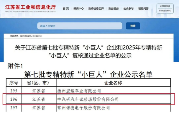 近日,江苏省工业和信息化厅公示第七批专精特新“小巨人”企业名单,中汽研汽车试验场股份有限公司凭借在汽车试验场领域突出的自主创新能力和核心竞争力成功上榜。