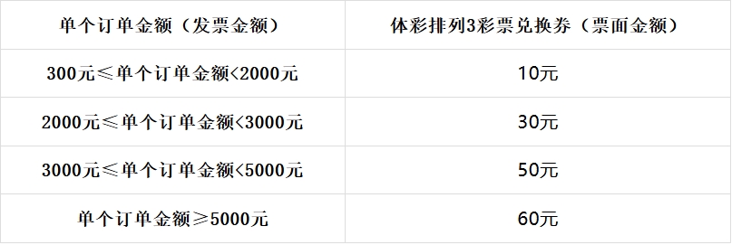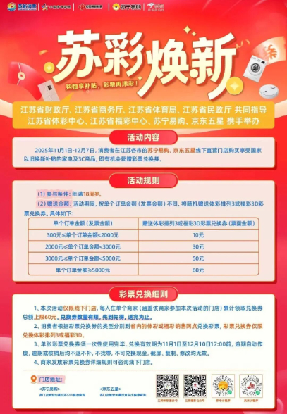 11月1日—12月7日,“苏新消费·苏彩焕新”第四期活动将全面开展。活动期间,年满18周岁的消费者,在江苏省内13个市的苏宁易购、京东五星线下直营门店购买享受国家以旧换新补贴指定商品(家电、3C商品),即有机会按单个订单消费金额(发票金额)获赠不同面值的彩票兑换券。其中,体彩赠送的是排列3彩票兑换券,兑换券以二维码形式发放。具体如下: