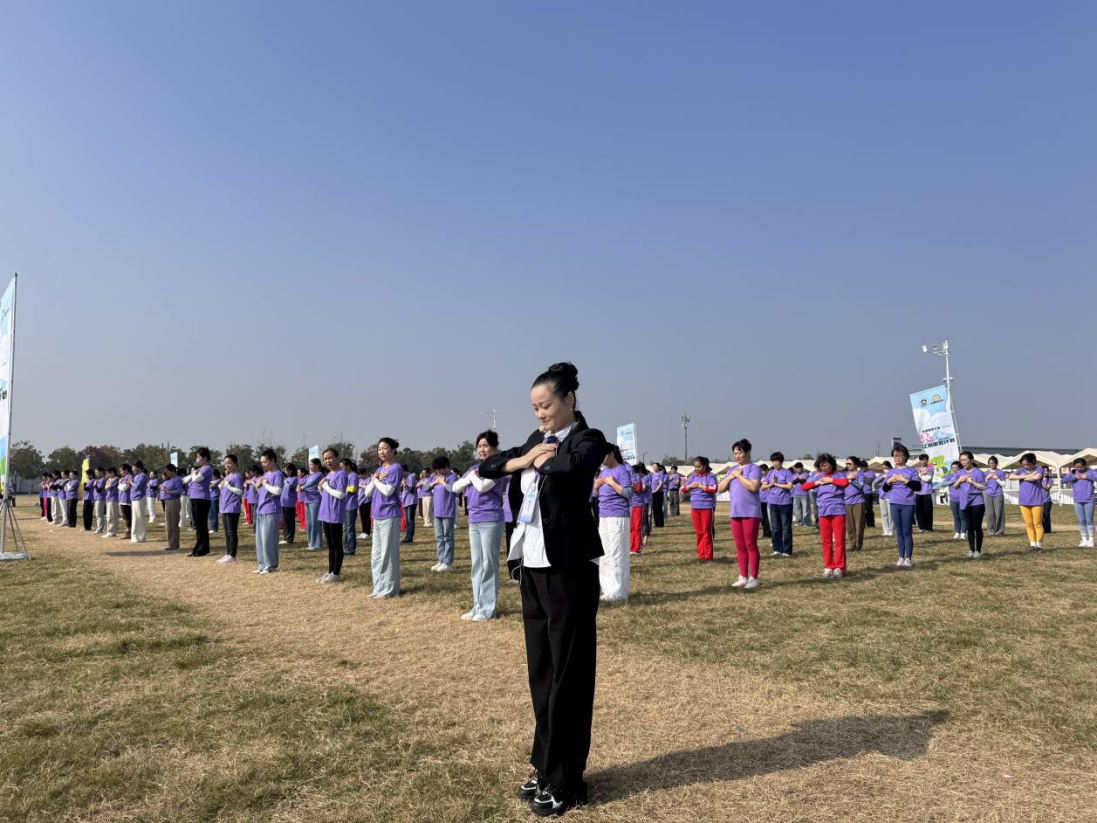 开幕式上,200名瑜伽爱好者身着统一紫色服装,在江心洲翠绿的大草坪上列阵。伴随《我爱你中国》的激昂旋律,众人同步舒展肢体,演绎整齐划一的瑜伽体式。成片“瑜伽紫”与满眼“生态绿”交相辉映,打造出极具视觉冲击力的沉浸式场景。