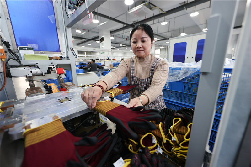 10月31日,工人在江苏省连云港市赣榆区厉庄镇一家防护用品企业的雨靴生产线上工作。