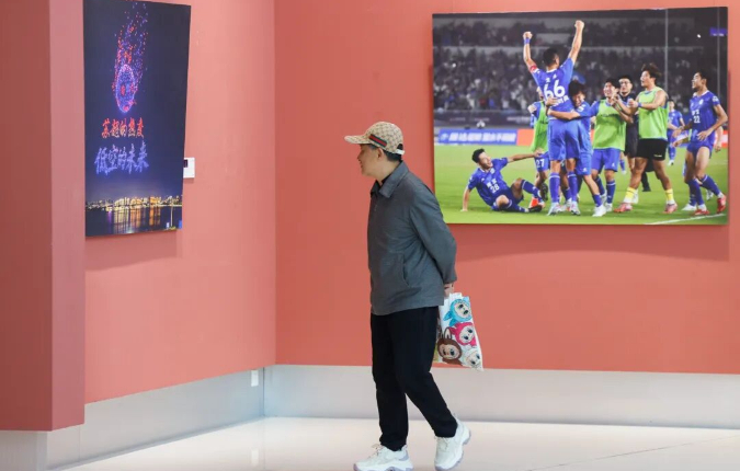 11月1日,“苏超”决赛当天,展览已在南京奥体中心东广场正式拉开帷幕。许多球迷纷纷在摄影作品前驻足打卡,沉浸在体育和艺术带来的热烈欢快的氛围中。彼时广场上快门声与欢呼声交织,不少人反复欣赏着定格赛场激情的照片,频频追问“在哪儿还能欣赏到这些好作品”。为了回应这份期待、更好满足大家深度观展的需求,这场融合体育热血与江苏风情的摄影展,已正式“移步”江苏省现代美术馆继续展出。