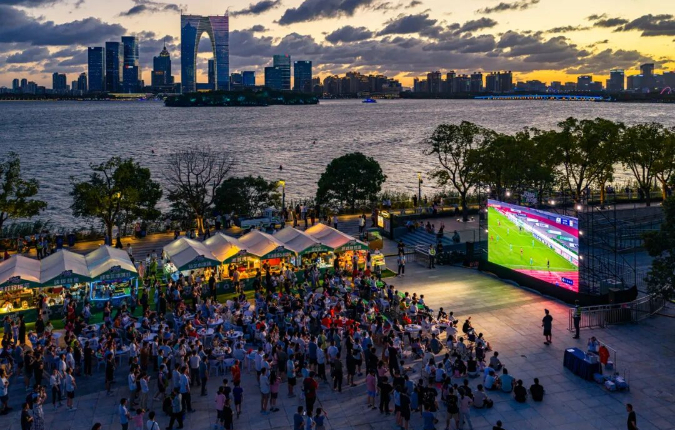 7月20日,苏州VS镇江。张锋 摄。苏州工业园区,市民在金鸡湖畔观看“苏超”,感受赛场火热激情,乐享夏夜足球盛宴。