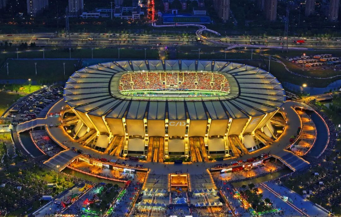 6月29日,苏州VS扬州,罗英 摄。苏州昆山奥体中心,夜幕下绽放着璀璨光芒,赛事与烟火在此交融,见证城市的动感与温度。