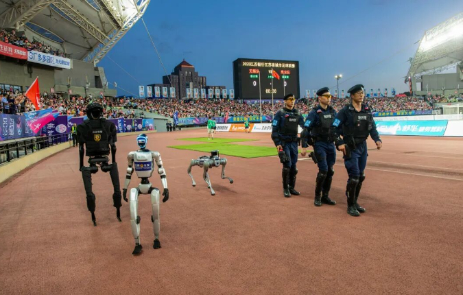 7月20日,无锡VS淮安。顾强 摄。无锡江阴市公安局采取“3+3”人机协同新巡防模式,将3名EPU特警队员和3台警用机器人或机器犬编为最小作战单元,共同开展巡逻。