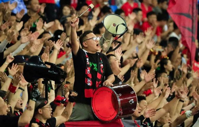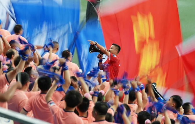 10月8日,盐城VS无锡,丁雪琴 摄。盐城球迷在现场敲锣助威,喊声震天。