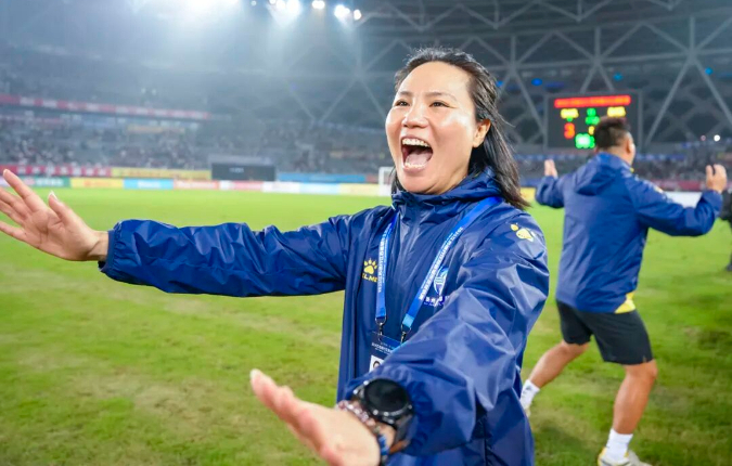 10月5日,徐州VS泰州,顾祥忠 摄。泰州队5:3淘汰徐州队晋级四强,泰州队主教练周高萍欢呼雀跃。