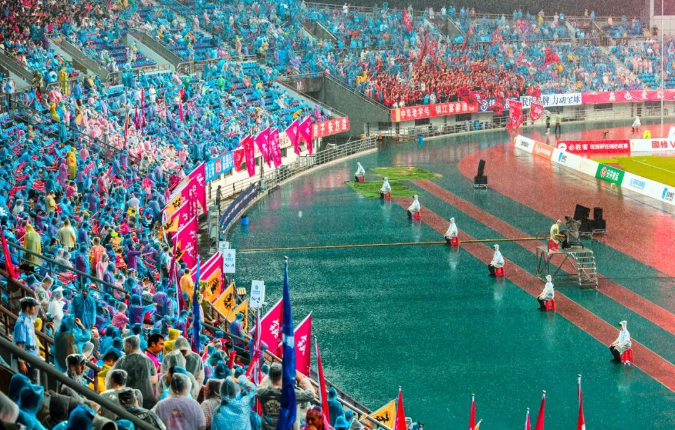 8月2日,镇江VS南通,陈云凤 摄。镇江比赛现场大雨滂沱,但球迷热情丝毫不减,镇江公安民警冒着大雨,坚守岗位,执行安保任务。