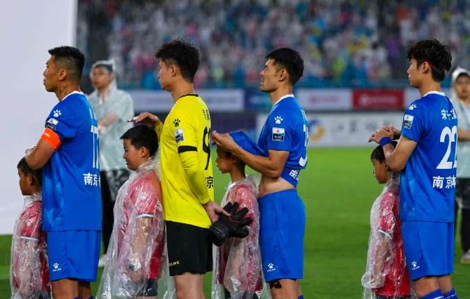 6月21日,常州VS南京,冯芃 摄。“苏超”常州队在雨中主场对阵南京队,赛前奏国歌时,球员们纷纷用球衣和双手为球童遮雨。