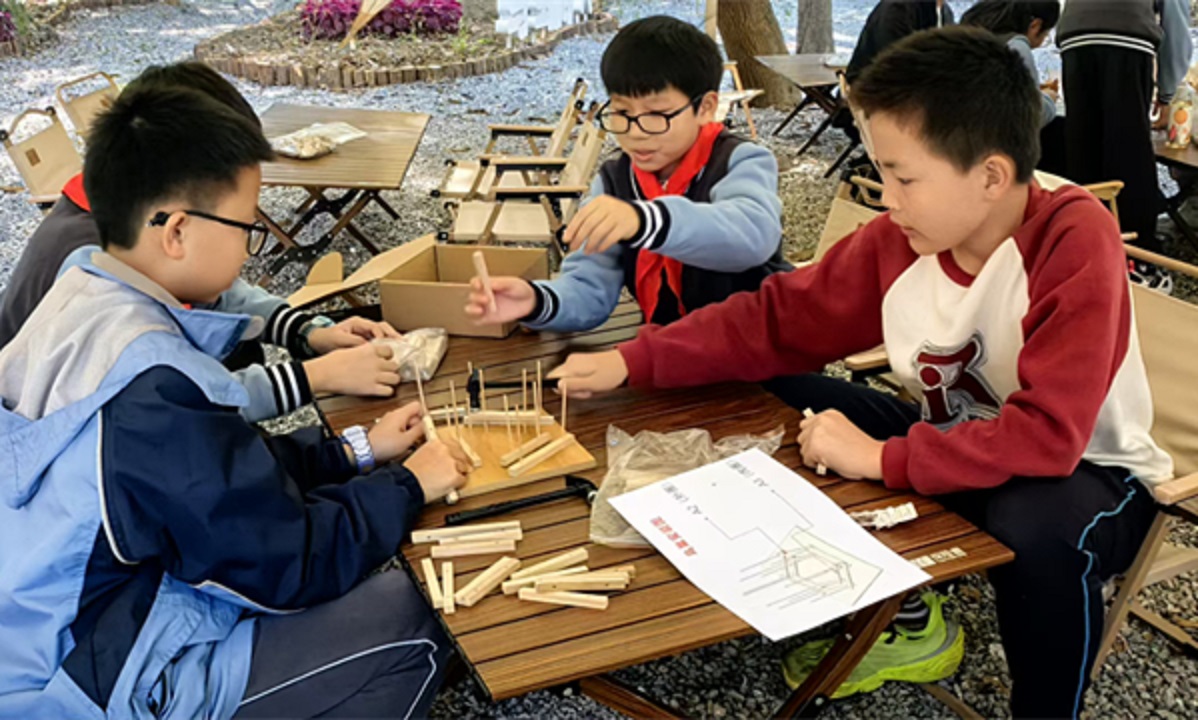 活动现场,东南大学建筑学院副教授、硕士生导师韩晓峰向孩子们传授了榫卯结构等传统木艺知识,指导他们亲手建造“昆虫旅馆/昆虫屋”,在动手实践中感悟工匠精神与文化传承。在林业大学生物多样性团队、拥有中国科学院南京地质古生物研究所工作背景与十六年科普经验朱磊团队专家的引领和互动下,使孩子们在探究昆虫习性、生物多样性和生态平衡的过程中,萌发了尊重生命、守护自然的价值观,为本次研学注入了科学内核。