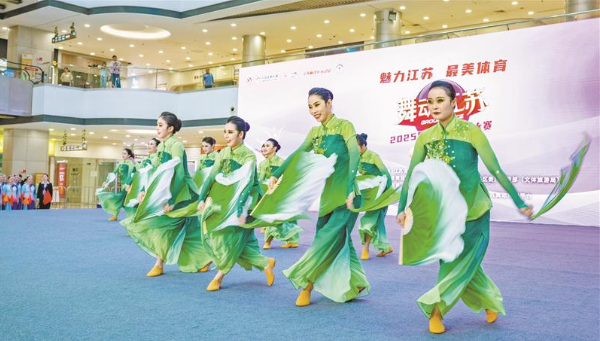 昨天,“魅力江苏 最美体育”——“舞动江苏”2025年全省广场舞总决赛在宝龙广场开赛,来自江苏各地的近两百名舞者参与比赛,最终无锡市新吴区旺庄街道舞蹈队自选以及规定曲目获得特等奖。图为旺庄街道舞蹈队在参赛中。(宗晓东 摄)