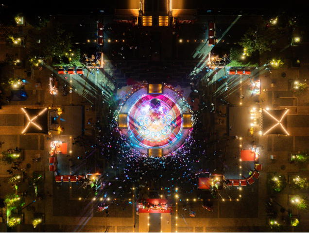 与往年不同的是,今年的演出巧妙利用广场空间,打造高低错落的四个舞台,观众跟随演出进度往返于不同舞台,与演员面对面接触;灯光系统也全面升级,根据不同演出篇章打造出不同的视觉效果。
