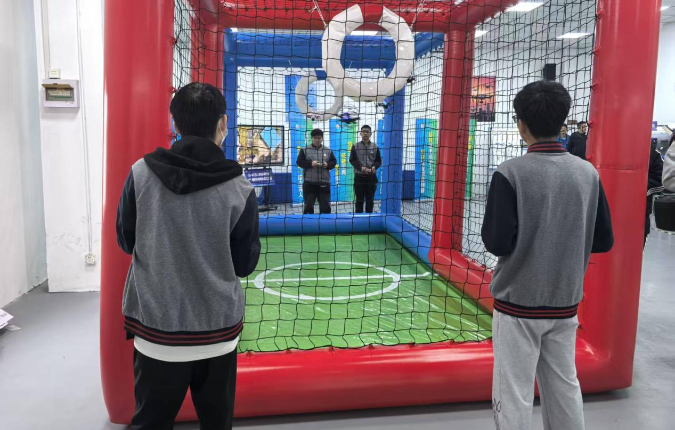 “嗡——”苏州高等职业技术学校内,黑色与白色的“无人机足球”在低空灵活穿梭,2022级学生何文杰微调摇杆躲避“防守”、精准“射门”,备战无人机足球赛。一旁,还有同学在进行无人机电力巡检仿真训练、无人机农业植保仿真训练、无人机维修定损训练等。