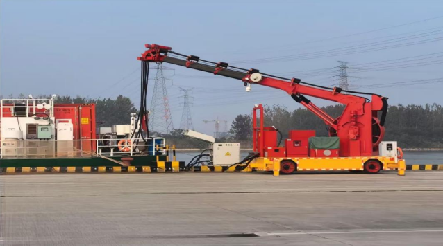 智能送缆设备由电缆管理系统和电动行进系统组成,可同时输送4根直流电缆和1根交流电缆,额定容量2.08MW,续航3km,能自主将电缆运送到船舶附近,既降低了工作人员劳动强度,又提升了工作效率。