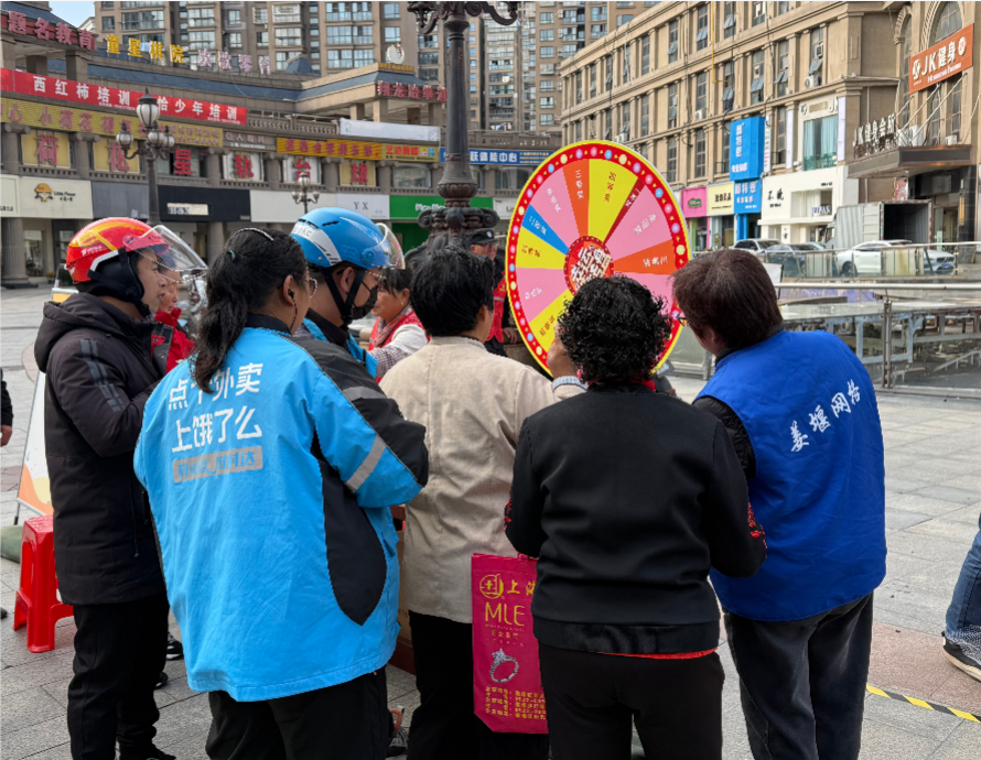 趣味互动聚欢笑,邻里情谊共生长。邻里互动区成为拉近彼此距离的“欢乐舞台”。幸运大转盘前排起长龙,参与积分兑换的居民均可获得抽奖机会,在欢声笑语中收获礼品与惊喜。踢毽子、筷子夹球、投沙包等趣味游戏吸引众多居民与新就业群体踊跃参与,大家在协作竞技中相识相熟,邻里情谊悄然滋长。微心愿交换墙前,居民与新就业群体纷纷写下可提供的专长或所需服务,一张张心愿卡片串联起邻里的善意与信任,搭建起互助共享的桥梁。