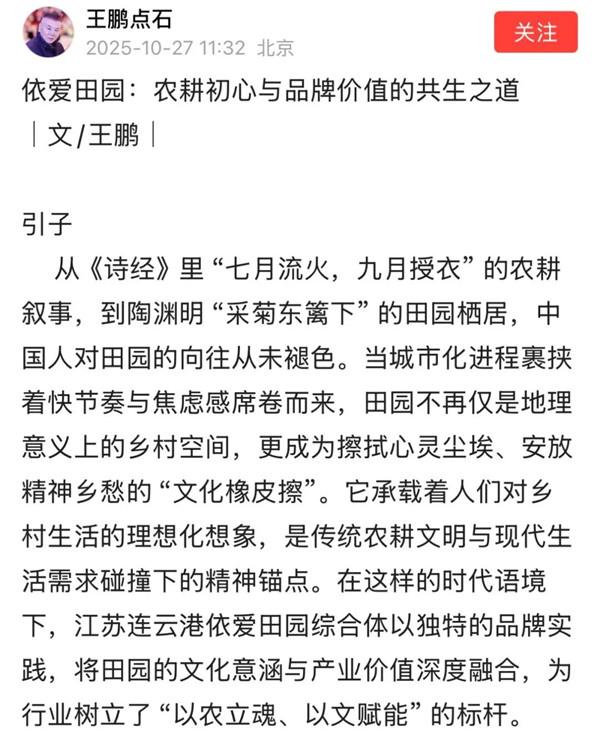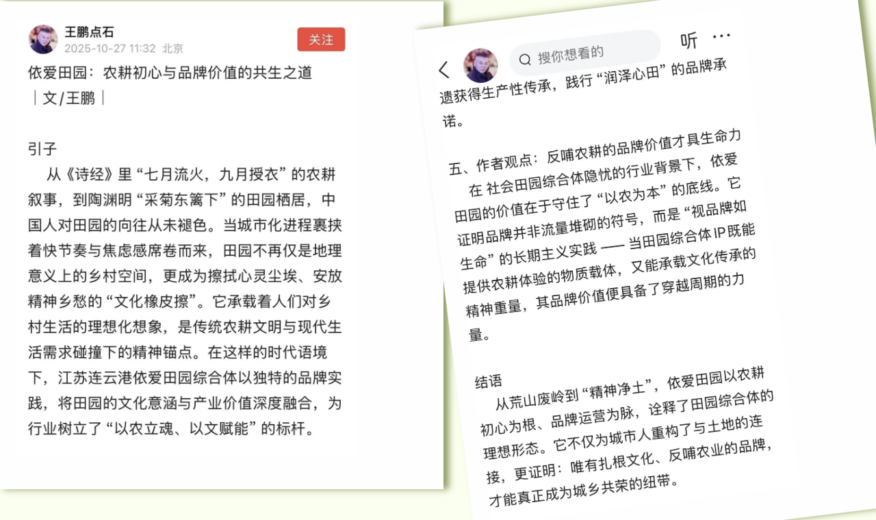 他认为:“江苏连云港依爱田园综合体以独特的品牌实践,将田园的文化意涵与产业价值深度融合,为行业树立了‘以农立魂、以文赋能’的标杆。”