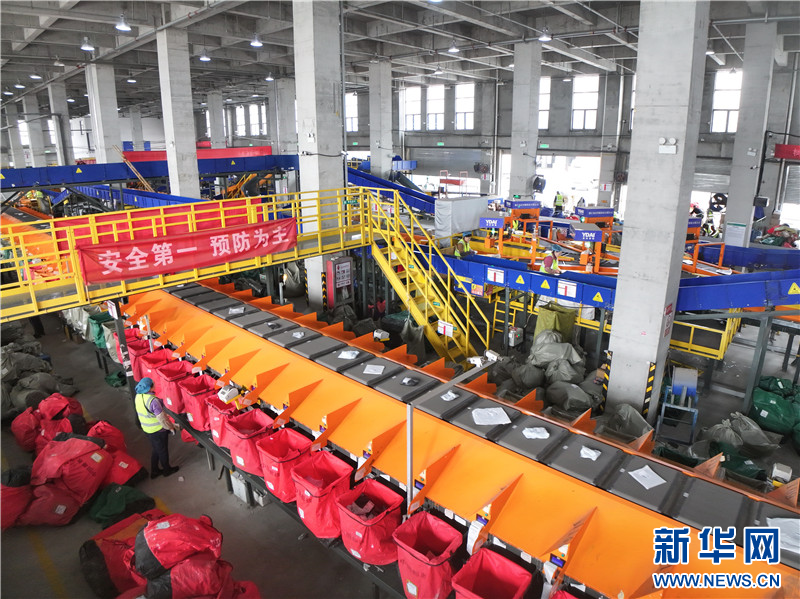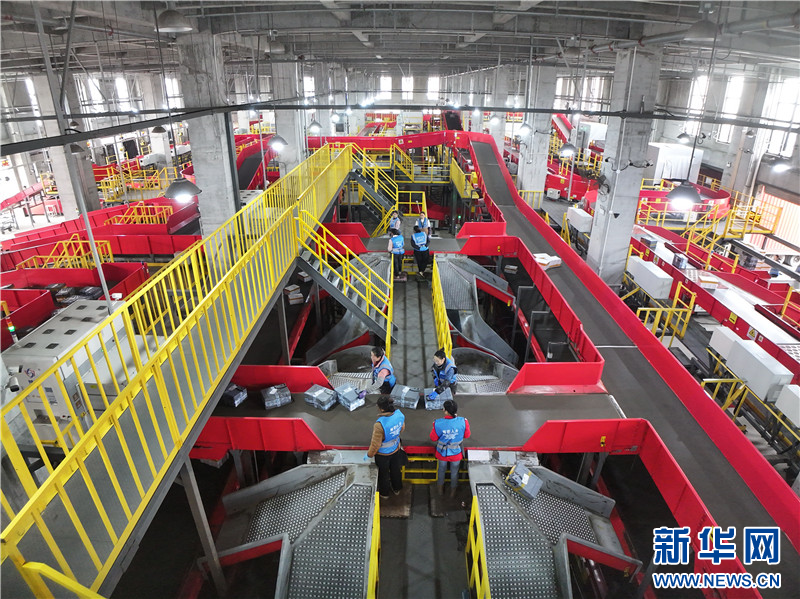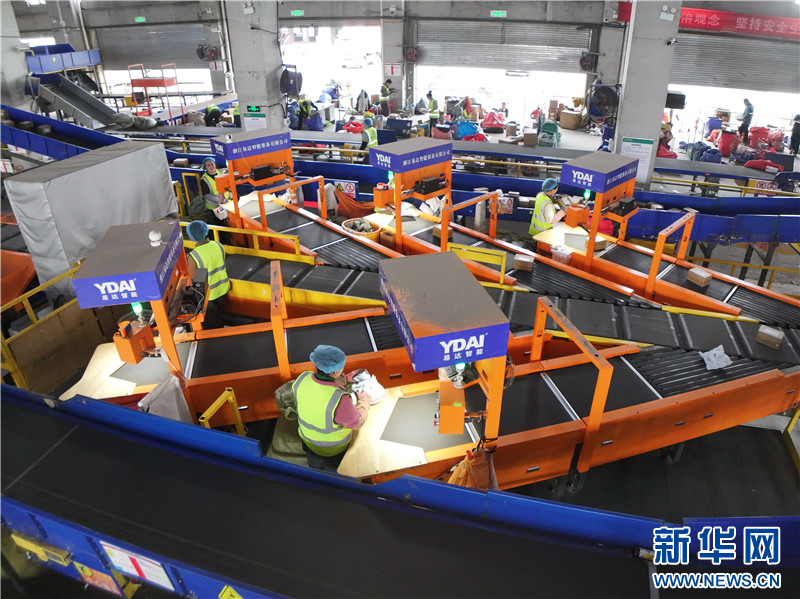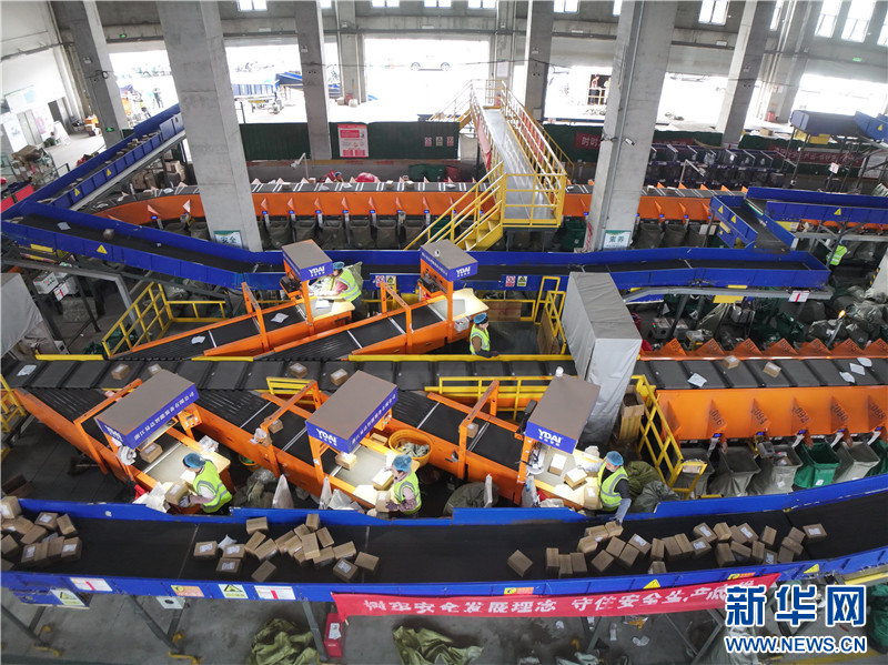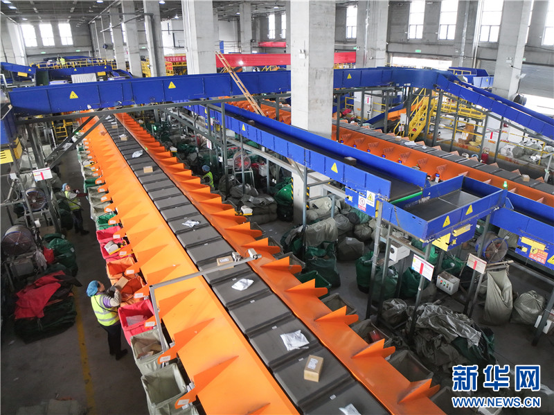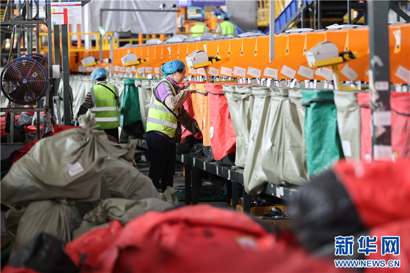 11月11日,在连云港市赣榆区,工作人员在分拣快递。“双十一”期间,连云港市各地电商和快递企业工作人员忙着打包、发货,一派繁忙景象。(司伟 姜玲玲)