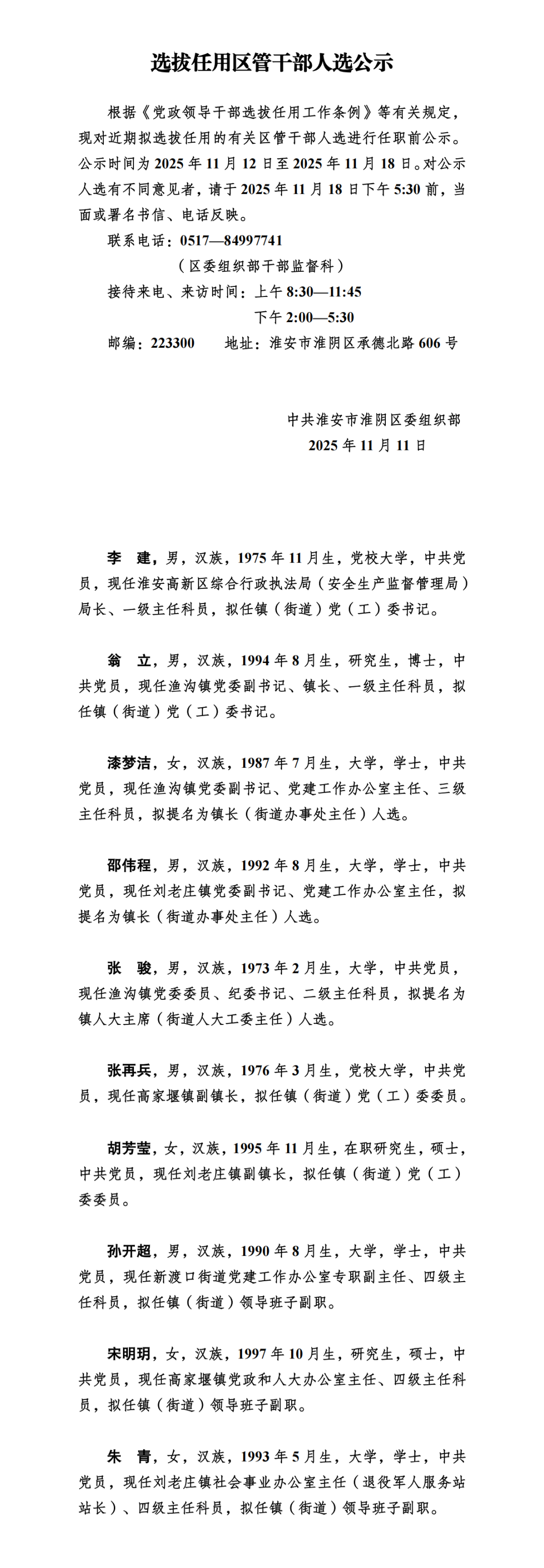 淮安市淮阴区发布选拔任用区管干部人选公示