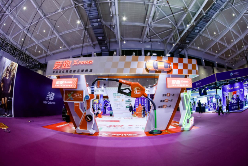 今年,爱跑X-Power”主题展区的设计,以“X”为核心视觉符号,融合南京城市特色与现代科技美感。整体造型以白色为主基调,象征洁净能源的纯粹与力量,辅以石化红色线条贯穿空间,勾勒出速度与激情的视觉节奏。局部点缀绿色灯光,呼应爱跑98号绿色清洁能源的环保属性,展现中国石化对绿色低碳未来的承诺。展区以简约而富有科技感的线条构成空间层次,形成视觉聚焦与流动感,营造出兼具城市人文底蕴与未来科技气息的沉浸式体验氛围,传递“洁净所能、为爱奔跑”的品牌精神。