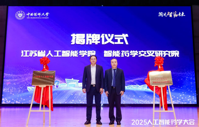 大会现场,江苏省人工智能学院与中国药科大学智能药学交叉研究院正式揭牌。这两个平台的建立,标志着学校在人工智能+药学交叉学科建设和人才培养方面迈出关键步伐。