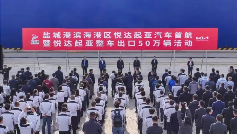 11月15日上午,悦达起亚整车出口第50万辆装船起航仪式在盐城港滨海港区举行,这也是悦达起亚汽车自大丰港区出口以来开通的新出海航线。盐城市市长严汉平出席仪式并宣布起航。副市长祁从峰,集团党委书记、董事长张乃文参加活动。