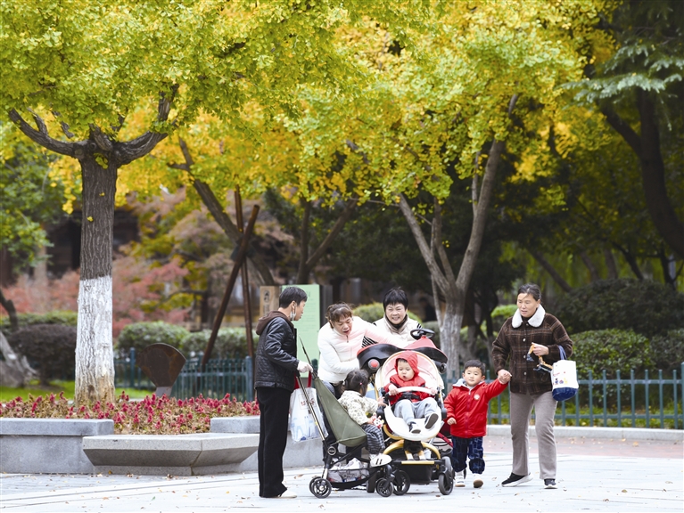 随着今年首场寒潮来袭,我市气温明显下降。图为昨天上午,中山公园里换上冬装出行的市民。(丁家骏 摄)